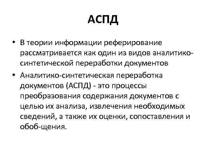 АСПД • В теории информации реферирование рассматривается как один из видов аналитико синтетической переработки документов • Аналитико синтетическая переработка документов (АСПД) это процессы преобразования содержания документов с целью их анализа, извлечения необходимых сведений, а также их оценки, сопоставления и обоб щения.