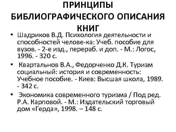 ПРИНЦИПЫ БИБЛИОГРАФИЧЕСКОГО ОПИСАНИЯ КНИГ • Шадриков В. Д. Психология деятельности и способностей челове ка: Учеб. пособие для вузов. 2 е изд. , перераб. и доп. М. : Логос, 1996. 320 с. • Квартальнов В. А. , Федорченко Д. К. Туризм социальный: история и современность: Учебное пособие. Киев: Высшая школа, 1989. 342 с. • Экономика современного туризма / Под ред. Р. А. Карповой. М. : Издательский торговый дом «Герда» , 1998. – 148 с.