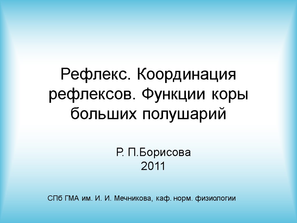 Рефлекс. Координация рефлексов. Функции коры больших полушарий Р. П.Борисова 2011 СПб ГМА им. И. И. Мечникова, каф. норм. физиологии