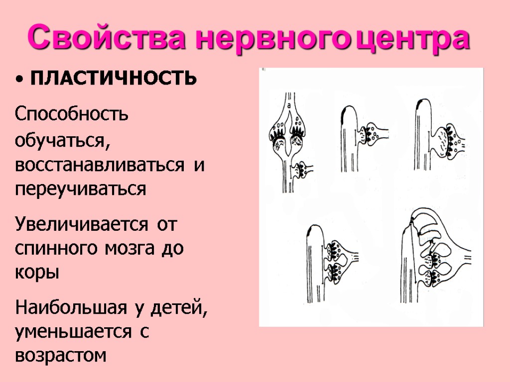 ПЛАСТИЧНОСТЬ Способность обучаться, восстанавливаться и переучиваться Увеличивается от спинного мозга до коры Наибольшая у детей, уменьшается с возрастом Свойства нервного центра