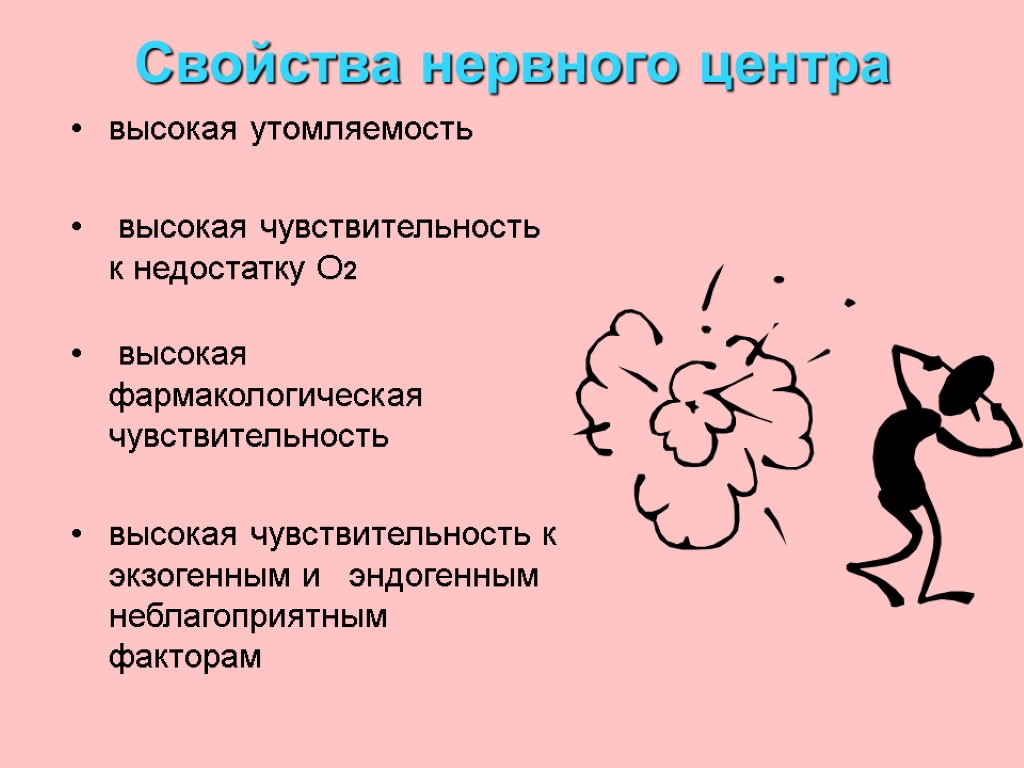Свойства нервного центра высокая утомляемость высокая чувствительность к недостатку О2 высокая фармакологическая чувствительность высокая чувствительность к экзогенным и эндогенным неблагоприятным факторам