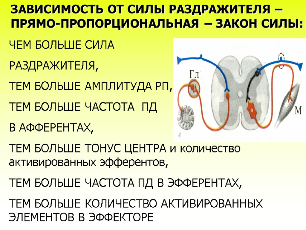 ЗАВИСИМОСТЬ ОТ СИЛЫ РАЗДРАЖИТЕЛЯ –ПРЯМО-ПРОПОРЦИОНАЛЬНАЯ – ЗАКОН СИЛЫ: ЧЕМ БОЛЬШЕ СИЛА РАЗДРАЖИТЕЛЯ, ТЕМ БОЛЬШЕ АМПЛИТУДА РП, ТЕМ БОЛЬШЕ ЧАСТОТА ПД В АФФЕРЕНТАХ, ТЕМ БОЛЬШЕ ТОНУС ЦЕНТРА и количество активированных эфферентов, ТЕМ БОЛЬШЕ ЧАСТОТА ПД В ЭФФЕРЕНТАХ, ТЕМ БОЛЬШЕ КОЛИЧЕСТВО АКТИВИРОВАННЫХ ЭЛЕМЕНТОВ В ЭФФЕКТОРЕ