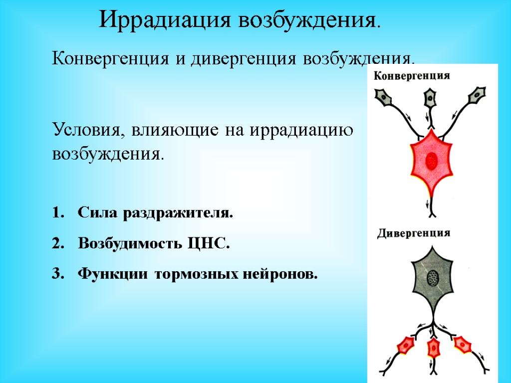 Иррадиация возбуждения. Конвергенция и дивергенция возбуждения. Условия, влияющие на иррадиацию возбуждения. Сила раздражителя. Возбудимость ЦНС. Функции тормозных нейронов.