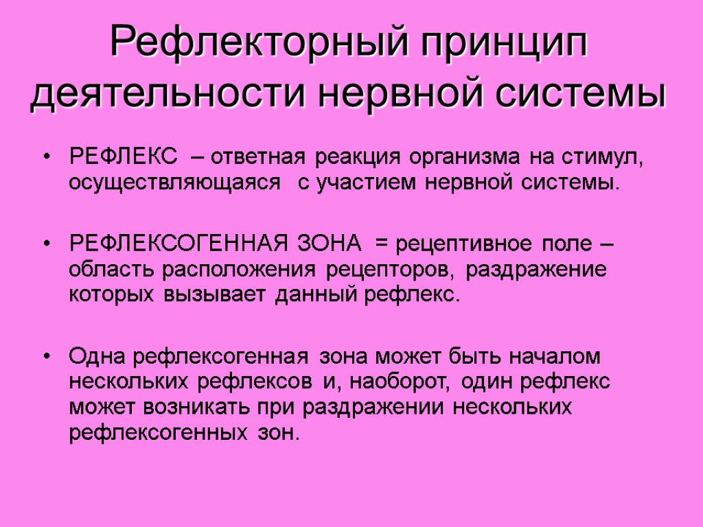 Рефлекторный принцип деятельности нервной системы РЕФЛЕКС – ответная реакция организма на стимул, осуществляющаяся с участием нервной системы. РЕФЛЕКСОГЕННАЯ ЗОНА = рецептивное поле – область расположения рецепторов, раздражение которых вызывает данный рефлекс. Одна рефлексогенная зона может быть началом нескольких рефлексов и, наоборот, один рефлекс может возникать при раздражении нескольких рефлексогенных зон.