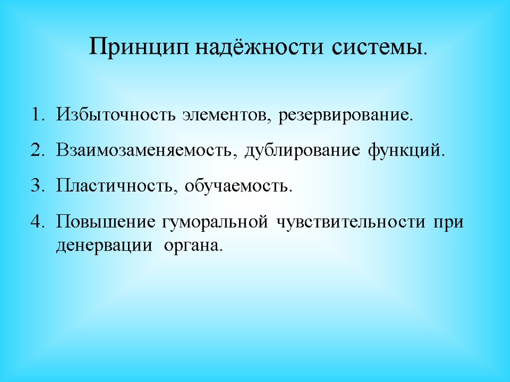 Принцип надёжности системы. Избыточность элементов, резервирование. Взаимозаменяемость, дублирование функций. Пластичность, обучаемость. Повышение гуморальной чувствительности при денервации органа.