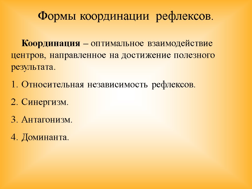 Формы координации рефлексов. Координация – оптимальное взаимодействие центров, направленное на достижение полезного результата. Относительная независимость рефлексов. Синергизм. Антагонизм. Доминанта.
