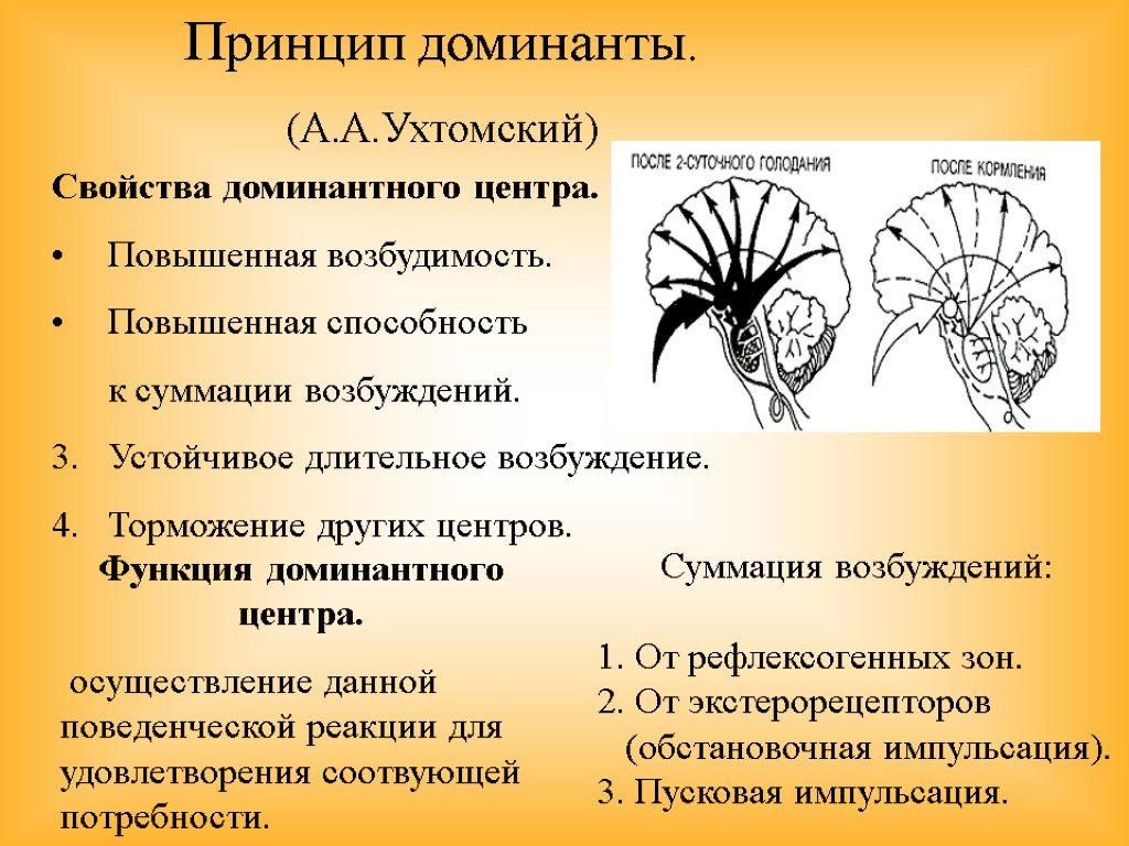 Принцип доминанты. (А.А.Ухтомский) Свойства доминантного центра. Повышенная возбудимость. Повышенная способность к суммации возбуждений. 3. Устойчивое длительное возбуждение. 4. Торможение других центров. Суммация возбуждений: 1. От рефлексогенных зон. 2. От экстерорецепторов (обстановочная импульсация). 3. Пусковая импульсация. Функция доминантного центра. осуществление данной поведенческой реакции для удовлетворения соотвующей потребности.