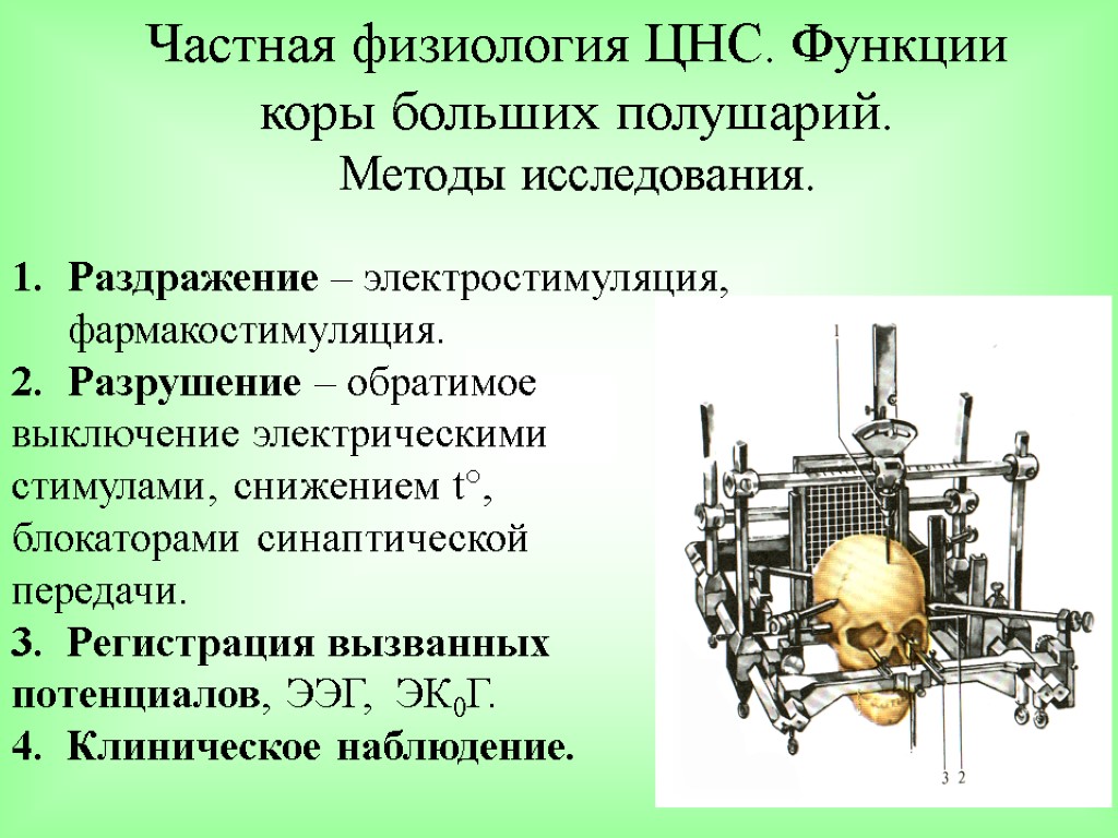 Частная физиология ЦНС. Функции коры больших полушарий. Методы исследования. Раздражение – электростимуляция, фармакостимуляция. Разрушение – обратимое выключение электрическими стимулами, снижением t°, блокаторами синаптической передачи. 3. Регистрация вызванных потенциалов, ЭЭГ, ЭК0Г. 4. Клиническое наблюдение.