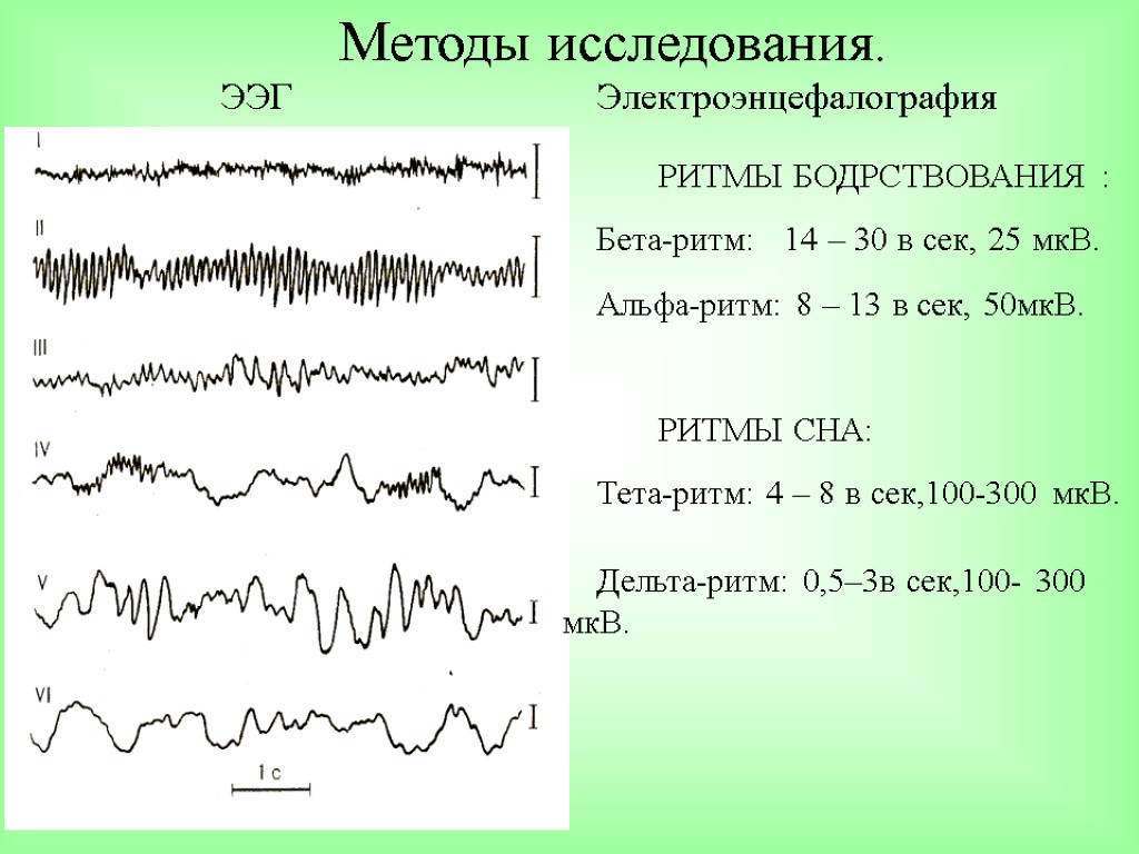 Методы исследования. РИТМЫ БОДРСТВОВАНИЯ : Бета-ритм: 14 – 30 в сек, 25 мкВ. Альфа-ритм: 8 – 13 в сек, 50мкВ. РИТМЫ СНА: Тета-ритм: 4 – 8 в сек,100-300 мкВ. Дельта-ритм: 0,5–3в сек,100- 300 мкВ. ЭЭГ Электроэнцефалография
