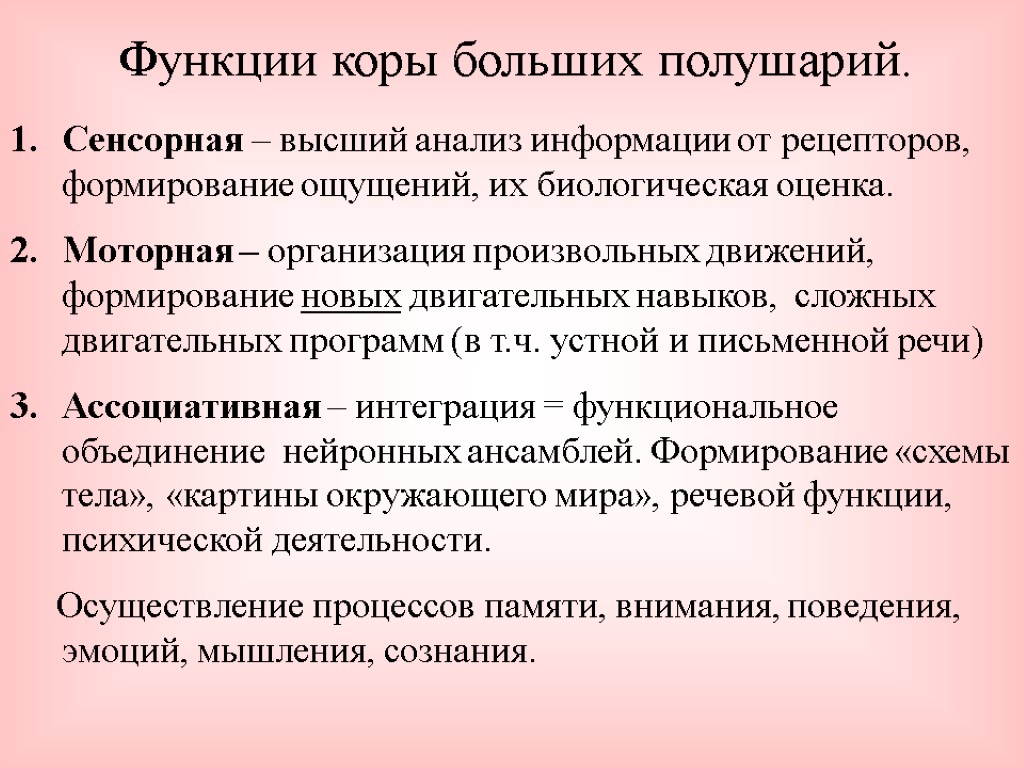 Функции коры больших полушарий. Сенсорная – высший анализ информации от рецепторов, формирование ощущений, их биологическая оценка. Моторная – организация произвольных движений, формирование новых двигательных навыков, сложных двигательных программ (в т.ч. устной и письменной речи) Ассоциативная – интеграция = функциональное объединение нейронных ансамблей. Формирование «схемы тела», «картины окружающего мира», речевой функции, психической деятельности. Осуществление процессов памяти, внимания, поведения, эмоций, мышления, сознания.