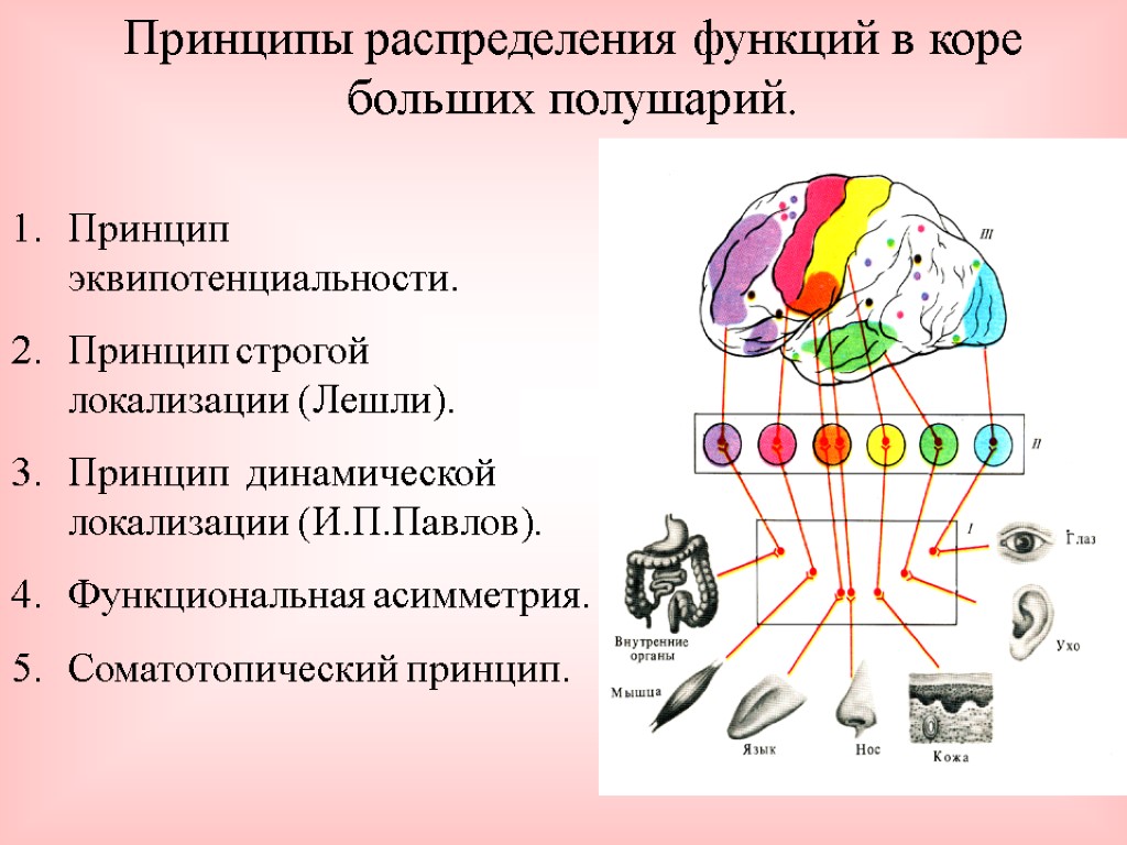 Принципы распределения функций в коре больших полушарий. Принцип эквипотенциальности. Принцип строгой локализации (Лешли). Принцип динамической локализации (И.П.Павлов). Функциональная асимметрия. Соматотопический принцип.