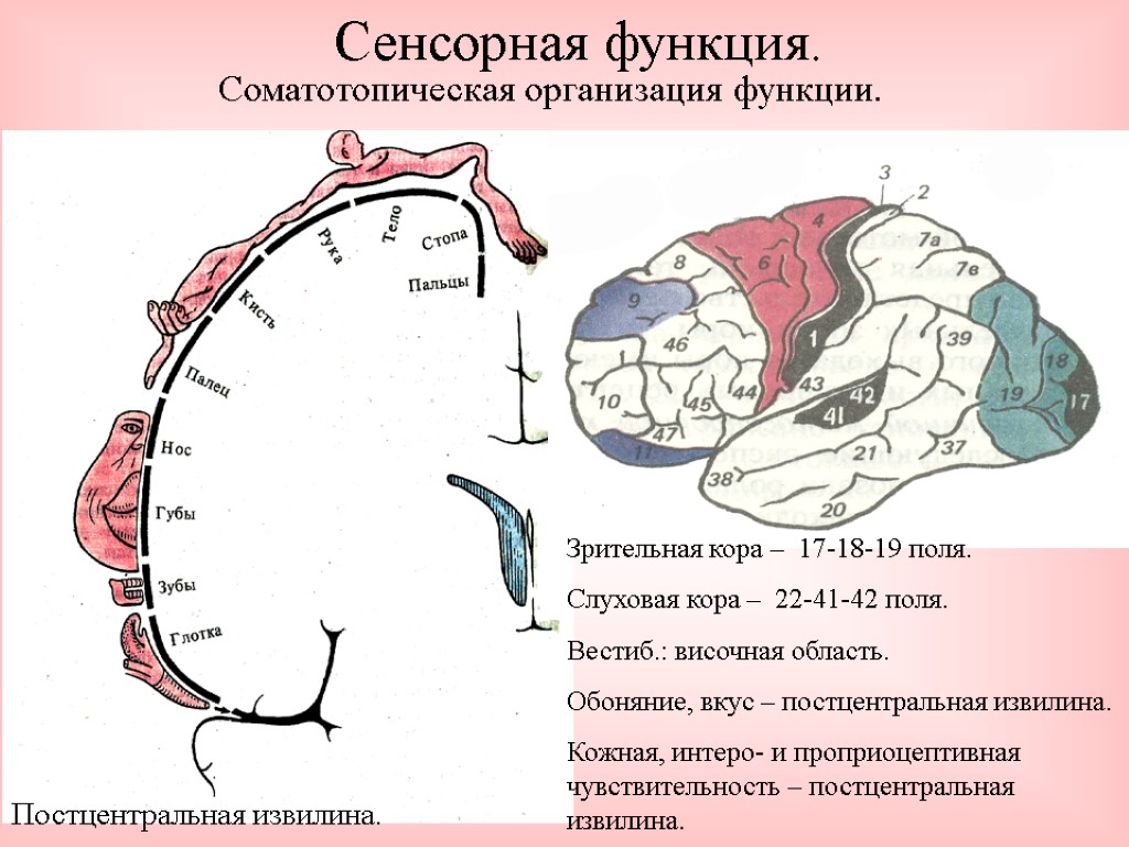 Сенсорная функция. Зрительная кора – 17-18-19 поля. Слуховая кора – 22-41-42 поля. Вестиб.: височная область. Обоняние, вкус – постцентральная извилина. Кожная, интеро- и проприоцептивная чувствительность – постцентральная извилина. Постцентральная извилина. Соматотопическая организация функции.