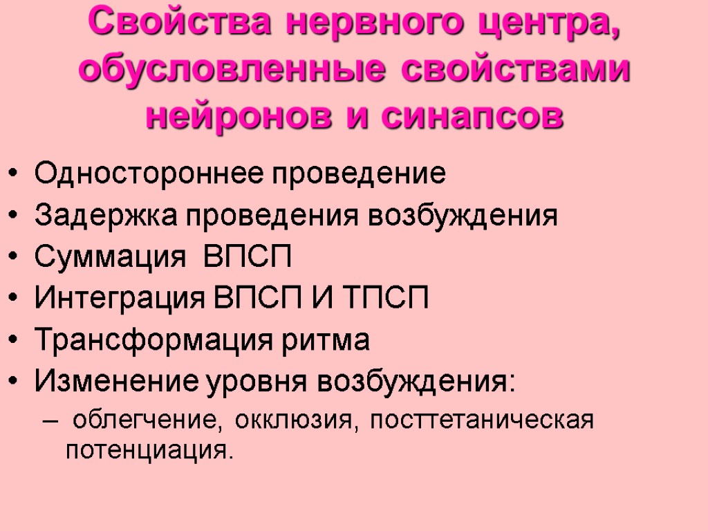 Свойства нервного центра, обусловленные свойствами нейронов и синапсов Одностороннее проведение Задержка проведения возбуждения Суммация ВПСП Интеграция ВПСП И ТПСП Трансформация ритма Изменение уровня возбуждения: облегчение, окклюзия, посттетаническая потенциация.