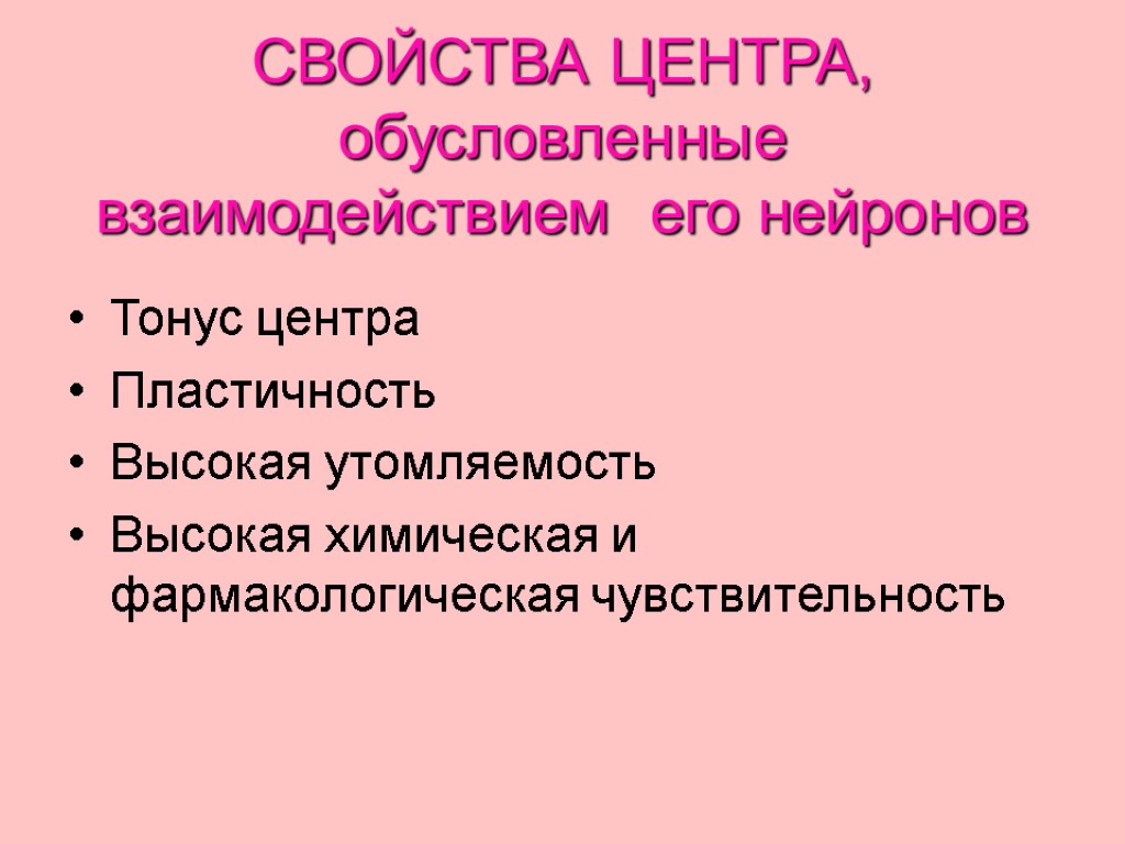СВОЙСТВА ЦЕНТРА, обусловленные взаимодействием его нейронов Тонус центра Пластичность Высокая утомляемость Высокая химическая и фармакологическая чувствительность