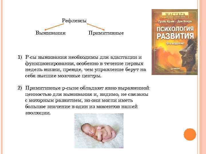 Рефлексы Выживания Примитивные 1) Р-сы выживания необходимы для адаптации и функционирования, особенно в течение первых недель жизни, прежде, чем управление берут на себя высшие мозговые центры. 2) Примитивные р-сыне обладают явно выраженной ценностью для выживания и, видимо, не связаны с моторным развитием, но они могли иметь большое значение в один из моментов нашей эволюции.