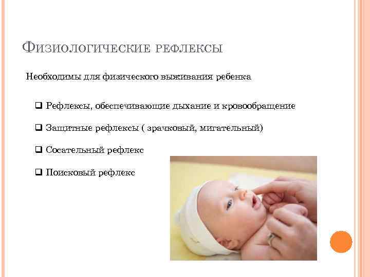 ФИЗИОЛОГИЧЕСКИЕ РЕФЛЕКСЫ Необходимы для физического выживания ребенка q Рефлексы, обеспечивающие дыхание и кровообращение q Защитные рефлексы ( зрачковый, мигательный) q Сосательный рефлекс q Поисковый рефлекс