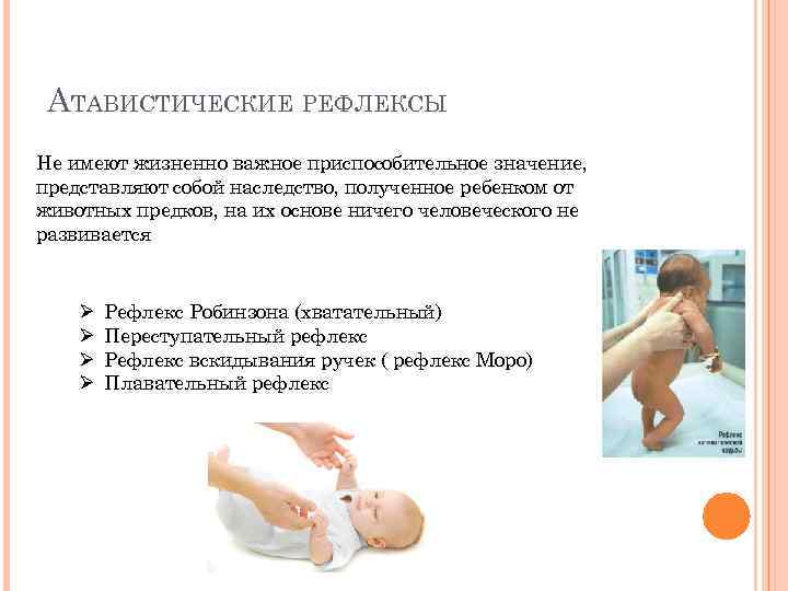 АТАВИСТИЧЕСКИЕ РЕФЛЕКСЫ Не имеют жизненно важное приспособительное значение, представляют собой наследство, полученное ребенком от животных предков, на их основе ничего человеческого не развивается Ø Ø Рефлекс Робинзона (хватательный) Переступательный рефлекс Рефлекс вскидывания ручек ( рефлекс Моро) Плавательный рефлекс