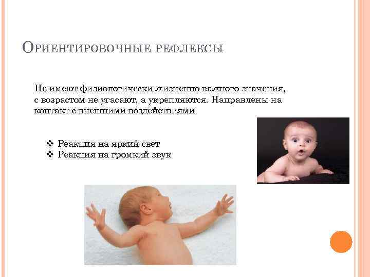 ОРИЕНТИРОВОЧНЫЕ РЕФЛЕКСЫ Не имеют физиологически жизненно важного значения, с возрастом не угасают, а укрепляются. Направлены на контакт с внешними воздействиями v Реакция на яркий свет v Реакция на громкий звук