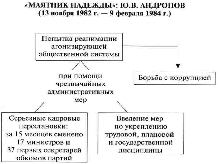 1. Предыстория перестройки После смерти Брежнева во главе партии и государства встал Ю. В. Андропов признал наличие многих нерешенных проблем, предпринимал меры по наведению порядка, Искоренению коррупции. Андропов выступал с позиций сохранения и обновления существующей системы. Деятельность Андропова была встречена в народе с симпатией, зародила в людях надежду на перемены к лучшему Юрий Владимирович Андропов