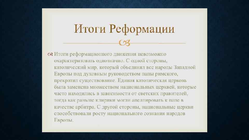 РЕФОРМАЦИЯВ АНГЛИИ • В Англии реформация победила самым мирным и спокойным путем. В 1534 году Король Генрих VIII Тюдор издал акт о супрематии (верховенство), который провозгласил короля главой церкви и отделил английскую церковь от папской курии, так возникает английская церковь.