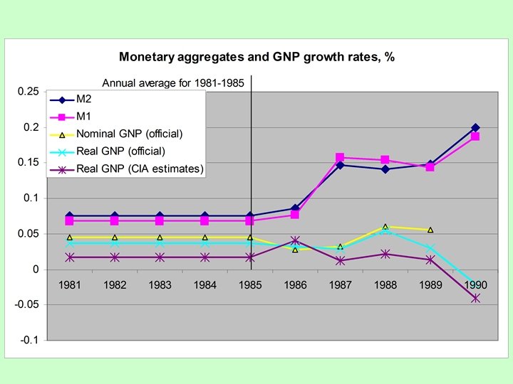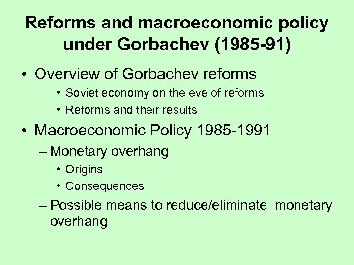 Reforms and macroeconomic policy under Gorbachev (1985 -91) • Overview of Gorbachev reforms • Soviet economy on the eve of reforms • Reforms and their results • Macroeconomic Policy 1985 -1991 – Monetary overhang • Origins • Consequences – Possible means to reduce/eliminate monetary overhang