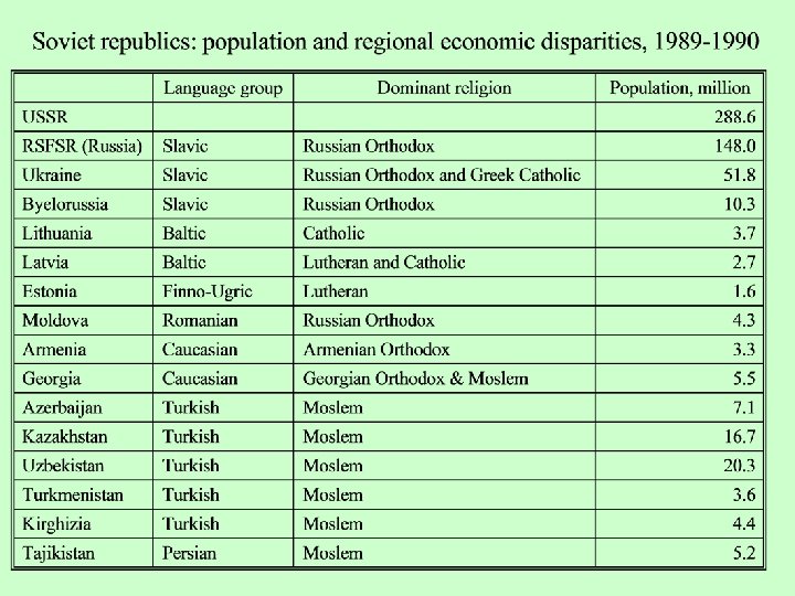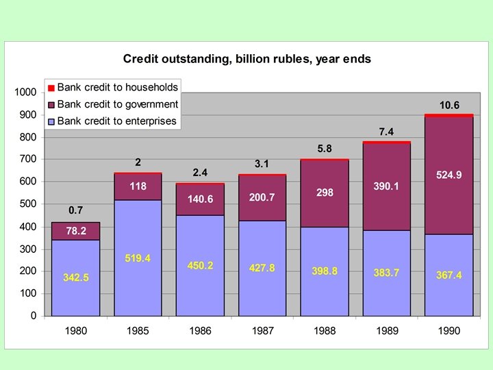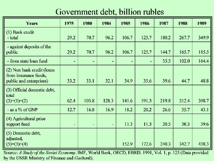 Soviet economy on the eve of the reforms: inefficient, but in good macroeconomic conditions • GDP in 1990: 1 trillion rubles • Economic growth in the late 1980 s - 1 to 3% • Low inflation level • One-time price increase in the early 1960 s for meat and milk products • Open and hidden inflation in 1947 -87 was less than 3% a year - very good record of macroeconomic stability • Slow growth of money supply • M 1 grows by less than 10% • Small public debt (less than 20% GDP in 1985) • Requirement for entering the euro-zone - less than 60% of GDP debt • Small stock of foreign currency reserves, but small external debt (about 3% GDP only) – Good reputation as a debtor