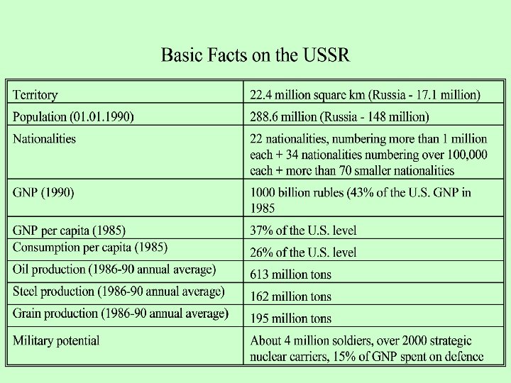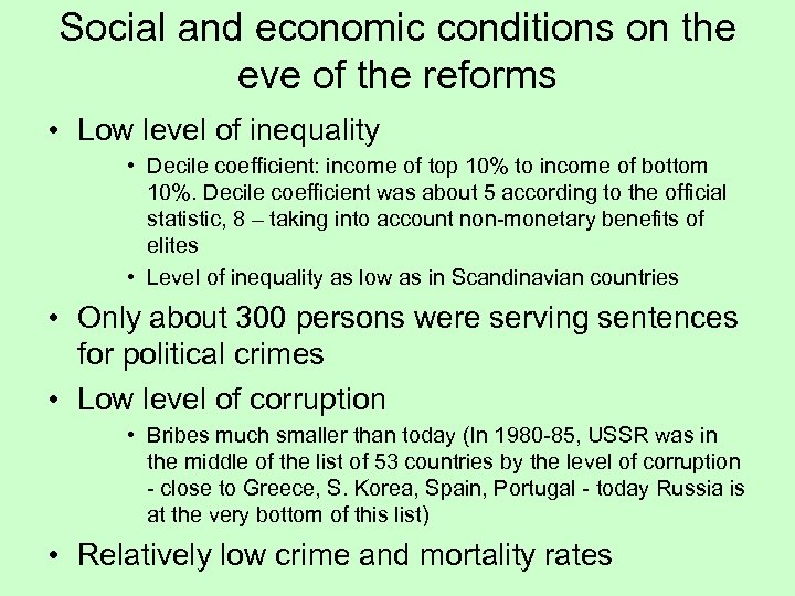 Social and economic conditions on the eve of the reforms • Low level of inequality • Decile coefficient: income of top 10% to income of bottom 10%. Decile coefficient was about 5 according to the official statistic, 8 – taking into account non-monetary benefits of elites • Level of inequality as low as in Scandinavian countries • Only about 300 persons were serving sentences for political crimes • Low level of corruption • Bribes much smaller than today (In 1980 -85, USSR was in the middle of the list of 53 countries by the level of corruption - close to Greece, S. Korea, Spain, Portugal - today Russia is at the very bottom of this list) • Relatively low crime and mortality rates