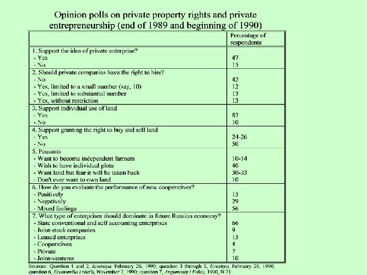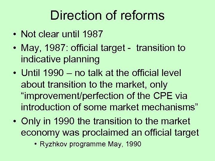 Direction of reforms • Not clear until 1987 • May, 1987: official target - transition to indicative planning • Until 1990 – no talk at the official level about transition to the market, only “improvement/perfection of the CPE via introduction of some market mechanisms” • Only in 1990 the transition to the market economy was proclaimed an official target • Ryzhkov programme May, 1990