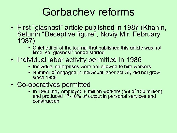 Gorbachev reforms • First “glasnost” article published in 1987 (Khanin, Selunin “Deceptive figure”, Noviy Mir, February 1987) • Chief editor of the journal that published this article was not fired, so “glasnost” period started • Individual labor activity permitted in 1986 • Individual enterprises were not allowed to hire workers • Number of engaged in individual labor activity did not grow since 1988 • Co-operatives permitted • In 1990 they employed 6 million workers (out of 130 million) and produced 17 -18% of output in personal services and construction