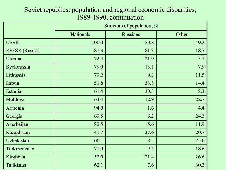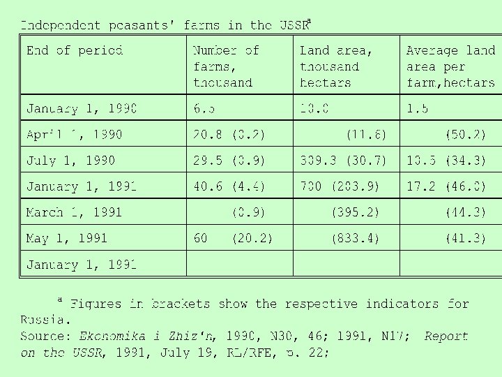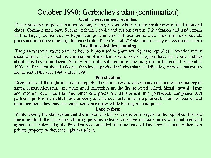 Gorbachev reforms • Leased enterprises • Employees of leased enterprises were given the right to buy it out from the state (using part of the profit of the enterprise itself) in 20 years, if they fulfill the production plans • Leased enterprises accounted for 20 -30% of output in retail sales, catering, and services • Independent (family) farming • Only 2% of agricultural output in 1993, about 5% in 2005 • Main problem: lack of investment • Average size: 42 hectares - smaller than US or even European farms • Joint ventures (enterprises with foreign capital) • At first, foreign control was not allowed: share of soviet capital should have been more than 51% • No significant capital inflow: in 1991 only 0. 1 million employed in joint enterprises