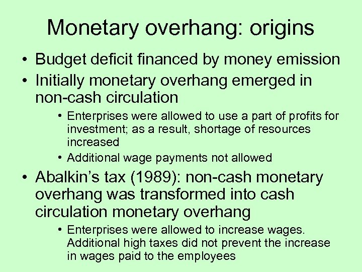Monetary overhang: origins • Budget deficit financed by money emission • Initially monetary overhang emerged in non-cash circulation • Enterprises were allowed to use a part of profits for investment; as a result, shortage of resources increased • Additional wage payments not allowed • Abalkin’s tax (1989): non-cash monetary overhang was transformed into cash circulation monetary overhang • Enterprises were allowed to increase wages. Additional high taxes did not prevent the increase in wages paid to the employees