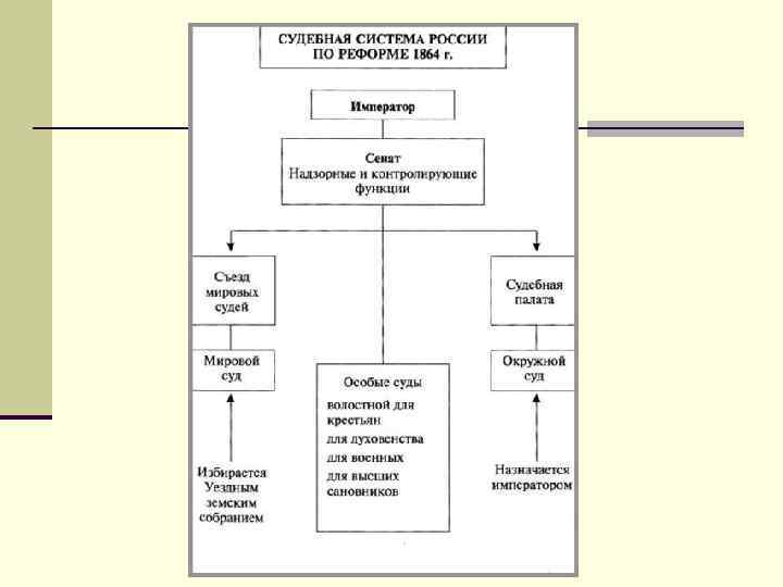Мировой суд в уездах и городах (для разбора гражданских исков на сумму до 500 руб. ) Без присяжных заседателей и адвокатов Мировые судьи избирались на уездных земских собраниях