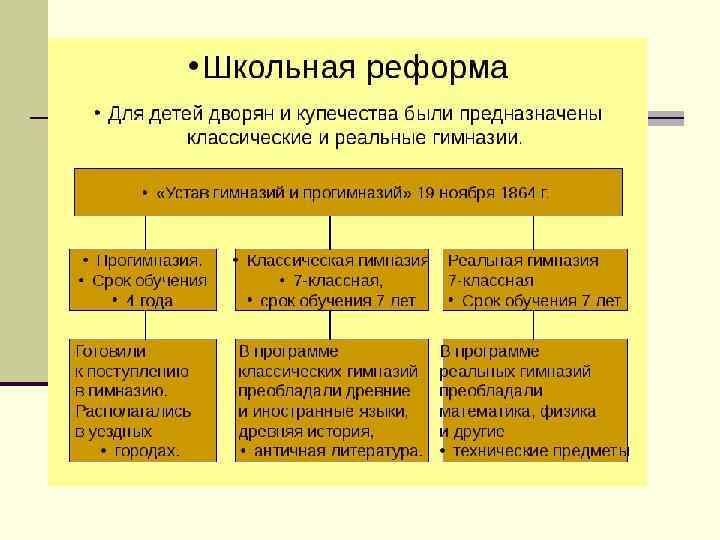 Реформы образования 1864 – «Устав гимназий и прогимназий» (бессословное образование) Гимназии: - Классические (право поступления в университеты без экзаменов) - Реальные (технический уклон) 1862 – женские гимназии (бывшие «институты благородных девиц» )