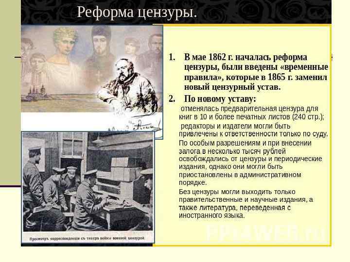 Судебная реформа 1864 Министр юстиции Д. Н. Замятнин, курировавший проведение судебной реформы Новые принципы судопроизводства: n бессословность суда n независимость от администрации n несменяемость судей и судебных следователей n равенство сословий перед законом n состязательность судебного процесса (прокурор и адвокат) n гласность судебного процесса n суд присяжных