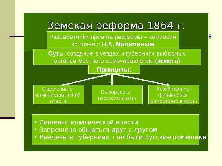 Земская реформа 1864 Николай Алексеевич Милютин Пётр Александрович Валуев Выборные органы местного самоуправления в губерниях (34 губернии европейской части России) и уездах Земские собрания (распорядительные органы) и земские управы (исполнительные органы)