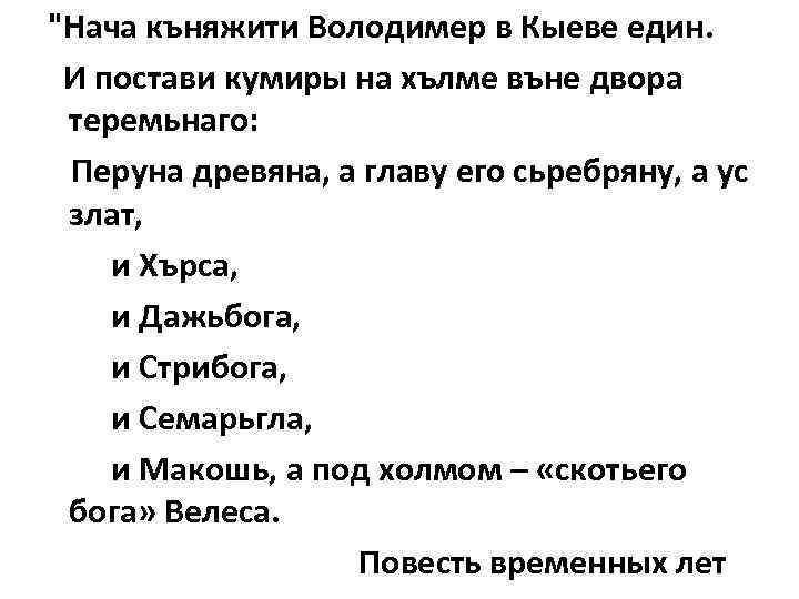 "Нача къняжити Володимер в Кыеве един. И постави кумиры на хълме въне двора теремьнаго: Перуна древяна, а главу его сьребряну, а yс злат, и Хърса, и Дажьбога, и Стрибога, и Семарьгла, и Макошь, а под холмом – «скотьего бога» Велеса. Повесть временных лет