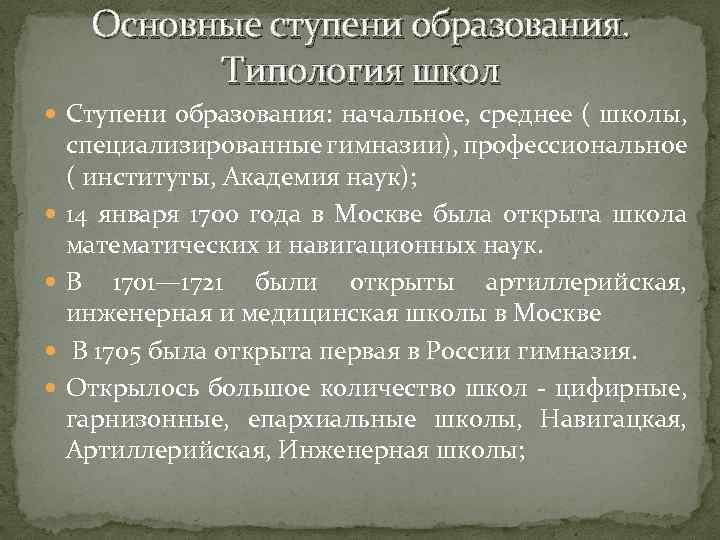 Основные ступени образования. Типология школ Ступени образования: начальное, среднее ( школы, специализированные гимназии), профессиональное ( институты, Академия наук); 14 января 1700 года в Москве была открыта школа математических и навигационных наук. В 1701— 1721 были открыты артиллерийская, инженерная и медицинская школы в Москве В 1705 была открыта первая в России гимназия. Открылось большое количество школ - цифирные, гарнизонные, епархиальные школы, Навигацкая, Артиллерийская, Инженерная школы;
