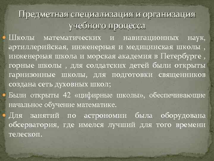 Предметная специализация и организация учебного процесса Школы математических и навигационных наук, артиллерийская, инженерная и медицинская школы , инженерная школа и морская академия в Петербурге , горные школы , для солдатских детей были открыты гарнизонные школы, для подготовки священников создана сеть духовных школ; Были открыты 42 «цифирные школы» , обеспечивающие начальное обучение математике. Для занятий по астрономии была оборудована обсерватория, где имелся лучший для того времени телескоп.