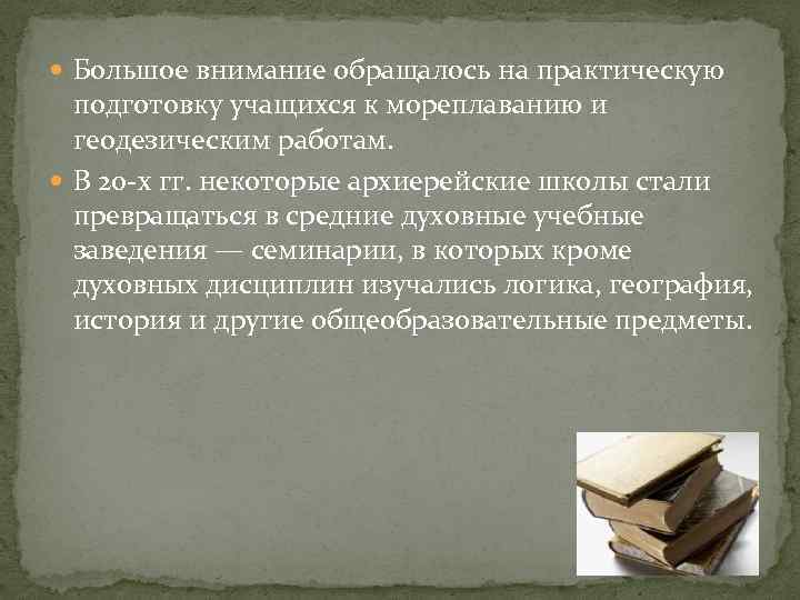 Большое внимание обращалось на практическую подготовку учащихся к мореплаванию и геодезическим работам. В 20 -х гг. некоторые архиерейские школы стали превращаться в средние духовные учебные заведения — семинарии, в которых кроме духовных дисциплин изучались логика, география, история и другие общеобразовательные предметы.