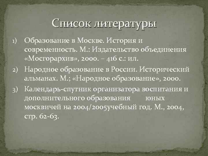 Список литературы Образование в Москве. История и современность. М. : Издательство объединения «Мосгорархив» , 2000. – 416 с. : ил. 2) Народное образование в России. Исторический альманах. М. ; «Народное образование» , 2000. 3) Календарь-спутник организатора воспитания и дополнительного образования юных москвичей на 2004/2005 учебный год. М. , 2004, стр. 62 -63. 1)