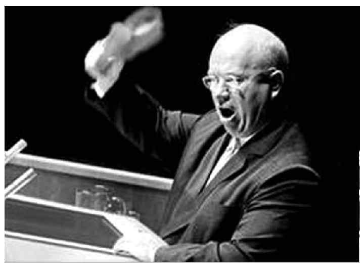 Курьёзы и крылатые фразы Н. С. Хрущёва • • • «Мы вас закопаем» (о капиталистических странах) «Пидорасы проклятые!» (о художниках-абстракционистах ) «Политики везде одинаковы: они обещают построить мост там, где и реки-то нет» «Ботинок Хрущева» -23 сентября 1960 года первый секретарь ЦК КПСС Никита Сергеевич Хрущев, выступая на сессии ООН, бил своим башмаком по трибуне и угрожающе кричал американской делегации: "Я вам покажу кузькину мать!". 12 октября 1960 года влиятельная американская газета "Нью-Йорк таймс" поместила на первой полосе снимок советского лидера Никиты Сергеевича Хрущева на сессии ООН с ботинком в руках и комментарий: Россия вновь угрожает миру, на этот раз - ботинком своего вождя. По семейной версии, вначале Хрущев выражал возмущение, стуча кулаками. В это время у него с руки слетели часы. Нагнувшись за ними, Никита Сергеевич извлек на всеобщее обозрение свою туфлю и стал колотить ею, убеждая собравшихся в собственной правоте… «Я вам покажу кузькину мать!» - американские лингвисты, например, до сих пор выясняют гносеологические корни выражения "Я вам покажу кузькину мать!", как известно, сопровождавшего башмачные манипуляции. Что ж за страшная такая мать у "Кузьки", если ею пугают Америку. Русские ядерщики на расспросы американских филологов ответили достойно: "кузькиной матерью" они назвали самую мощную советскую бомбу, вскоре испытанную на Новой Земле…
