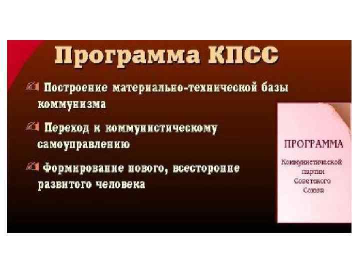Курс на построение коммунизма • III Программа КПСС предусматривала построение коммунизма к 1980 г. Высшая цель партии, говорилось в программе, «построить коммунистическое общество, на знамени которого начертано: «От каждого — по способностям, каждому — по потребностям» . «Нынешнее поколение советских людей будет жить при коммунизме» — знаменитая фраза Никиты Сергеевича Хрущёва, произнесённая на XXII съезде КПСС в 1961 году. • Во время своего выступления Н. С. Хрущёв объявил, что к 1980 году в СССР будет построен коммунизм (точнее, материально-техническая база коммунизма): «Советский Союз превзойдет по производству продукции на душу населения наиболее мощную и богатую страну капитализма – США; значительно поднимется материальное благосостояние и культурно-технический уровень трудящихся, всем будет обеспечен материальный достаток; все колхозы и совхозы превратятся в высокопроизводительные и высокодоходные хозяйства; в основном будут удовлетворены потребности советских людей в благоустроенных жилищах; исчезнет тяжелый физический труд; СССР станет страной самого короткого рабочего дня» .