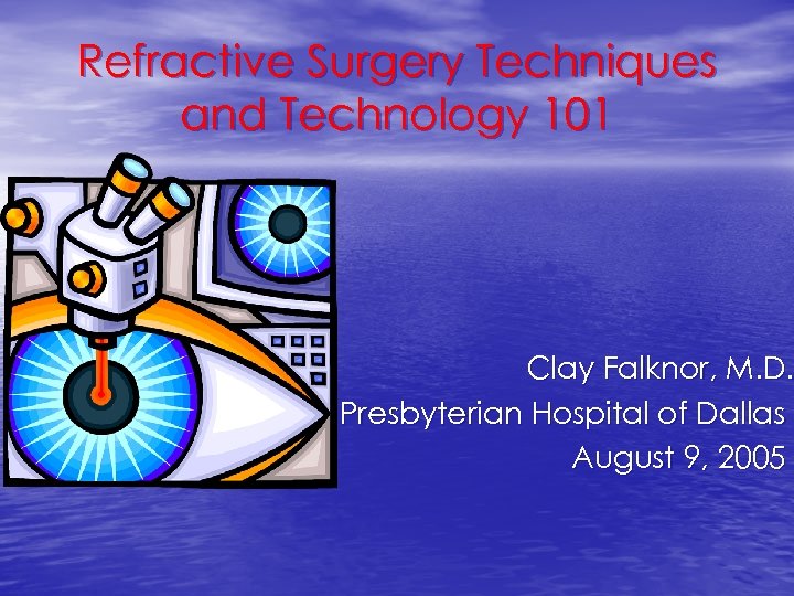 Refractive Surgery Techniques and Technology 101 Clay Falknor, M. D. Presbyterian Hospital of Dallas August 9, 2005