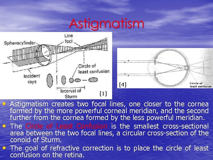 Astigmatism [4] [1] • Astigmatism creates two focal lines, one closer to the cornea • • formed by the more powerful corneal meridian, and the second further from the cornea formed by the less powerful meridian. The Circle of Least Confusion is the smallest cross-sectional area between the two focal lines, a circular cross-section of the conoid of Sturm. The goal of refractive correction is to place the circle of least confusion on the retina.