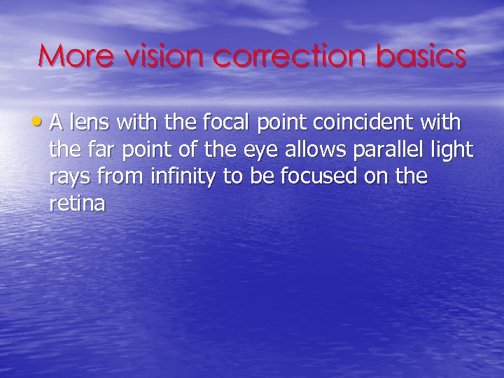 More vision correction basics • A lens with the focal point coincident with the far point of the eye allows parallel light rays from infinity to be focused on the retina