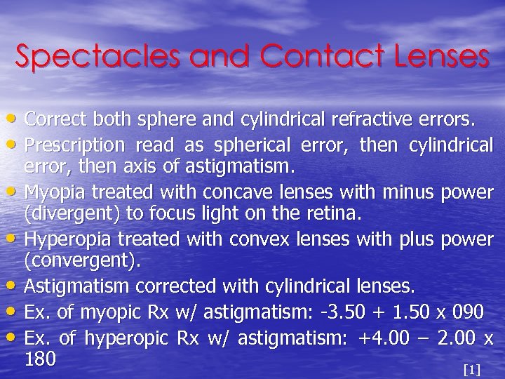 Spectacles and Contact Lenses • Correct both sphere and cylindrical refractive errors. • Prescription read as spherical error, then cylindrical • • • error, then axis of astigmatism. Myopia treated with concave lenses with minus power (divergent) to focus light on the retina. Hyperopia treated with convex lenses with plus power (convergent). Astigmatism corrected with cylindrical lenses. Ex. of myopic Rx w/ astigmatism: -3. 50 + 1. 50 x 090 Ex. of hyperopic Rx w/ astigmatism: +4. 00 – 2. 00 x 180 [1]