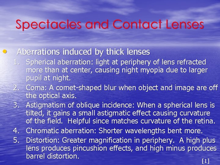 Spectacles and Contact Lenses • Aberrations induced by thick lenses 1. Spherical aberration: light at periphery of lens refracted more than at center, causing night myopia due to larger pupil at night. 2. Coma: A comet-shaped blur when object and image are off the optical axis. 3. Astigmatism of oblique incidence: When a spherical lens is tilted, it gains a small astigmatic effect causing curvature of the field. Helpful since matches curvature of the retina. 4. Chromatic aberration: Shorter wavelengths bent more. 5. Distortion: Greater magnification in periphery. A high plus lens produces pincushion effects, and high minus produces barrel distortion. [1]