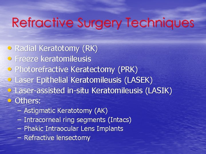 Refractive Surgery Techniques • Radial Keratotomy (RK) • Freeze keratomileusis • Photorefractive Keratectomy (PRK) • Laser Epithelial Keratomileusis (LASEK) • Laser-assisted in-situ Keratomileusis (LASIK) • Others: – – Astigmatic Keratotomy (AK) Intracorneal ring segments (Intacs) Phakic Intraocular Lens Implants Refractive lensectomy