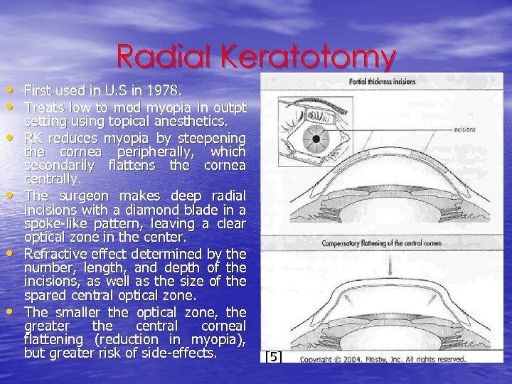 Radial Keratotomy • First used in U. S in 1978. • Treats low to mod myopia in outpt • • setting using topical anesthetics. RK reduces myopia by steepening the cornea peripherally, which secondarily flattens the cornea centrally. The surgeon makes deep radial incisions with a diamond blade in a spoke-like pattern, leaving a clear optical zone in the center. Refractive effect determined by the number, length, and depth of the incisions, as well as the size of the spared central optical zone. The smaller the optical zone, the greater the central corneal flattening (reduction in myopia), but greater risk of side-effects. [5]