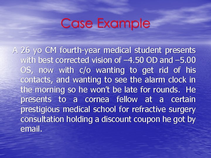 Case Example A 26 yo CM fourth-year medical student presents with best corrected vision of – 4. 50 OD and – 5. 00 OS, now with c/o wanting to get rid of his contacts, and wanting to see the alarm clock in the morning so he won’t be late for rounds. He presents to a cornea fellow at a certain prestigious medical school for refractive surgery consultation holding a discount coupon he got by email.